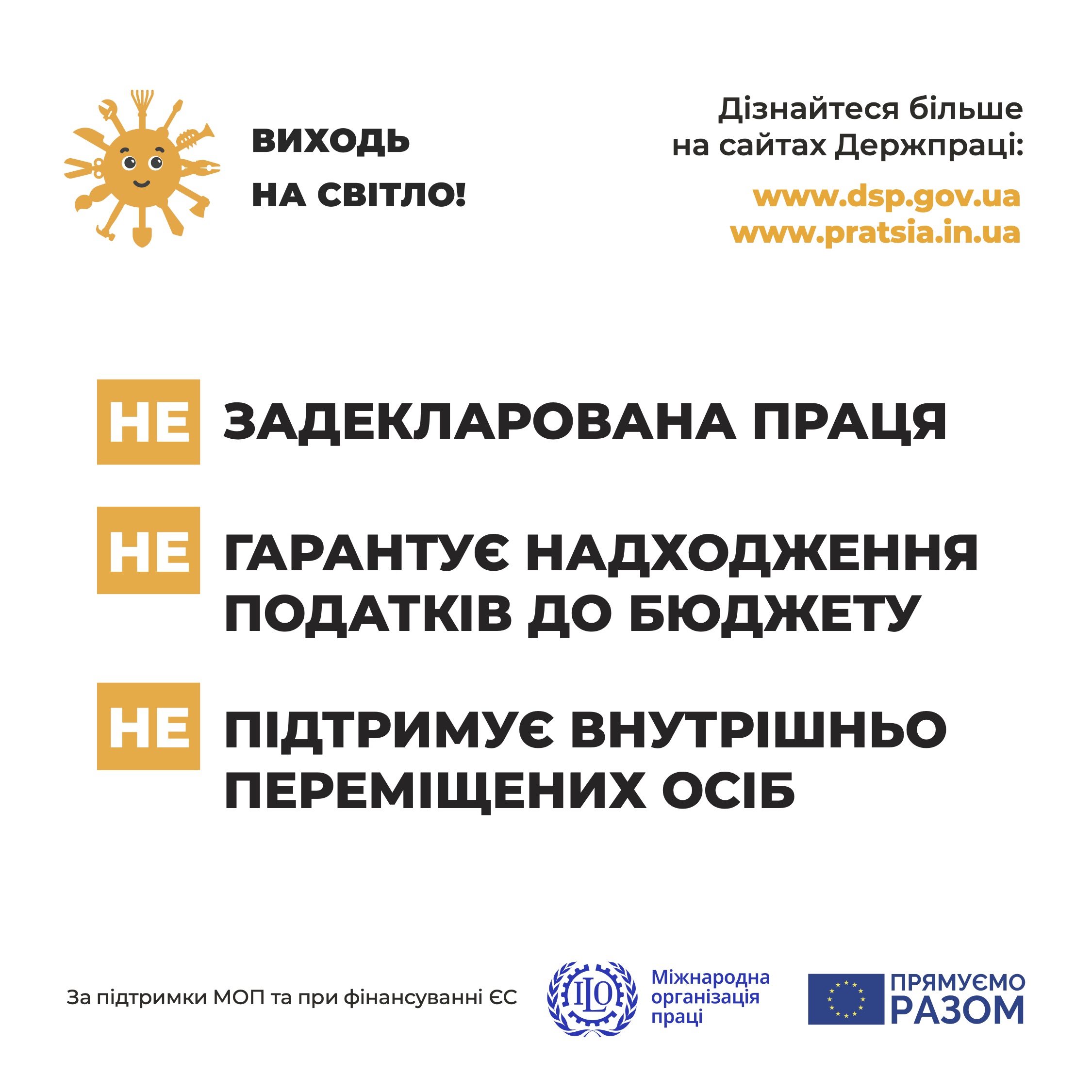 Інформаційна компанія “Виходь на світло!”Державна служба України з питань прації та її територіальні органи проводять інформаційну компанію “Виходять на світло!” Кожен, хто вважає себе українцем і громадянином нашої держави має розуміти, що задекларована праця – це шлях до вільної. незалежної, економічно сильної держави!